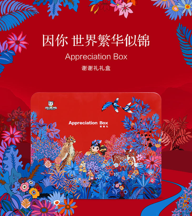 禮盒以紅色為主,希望給到人們溫暖的感覺。通過手繪的形式,描繪出一副五彩斑斕、栩栩如生的童話世界,通過動物之間的關系,以及他們在花叢中的不同形態,間接的表達出我們想對Ta說的話: