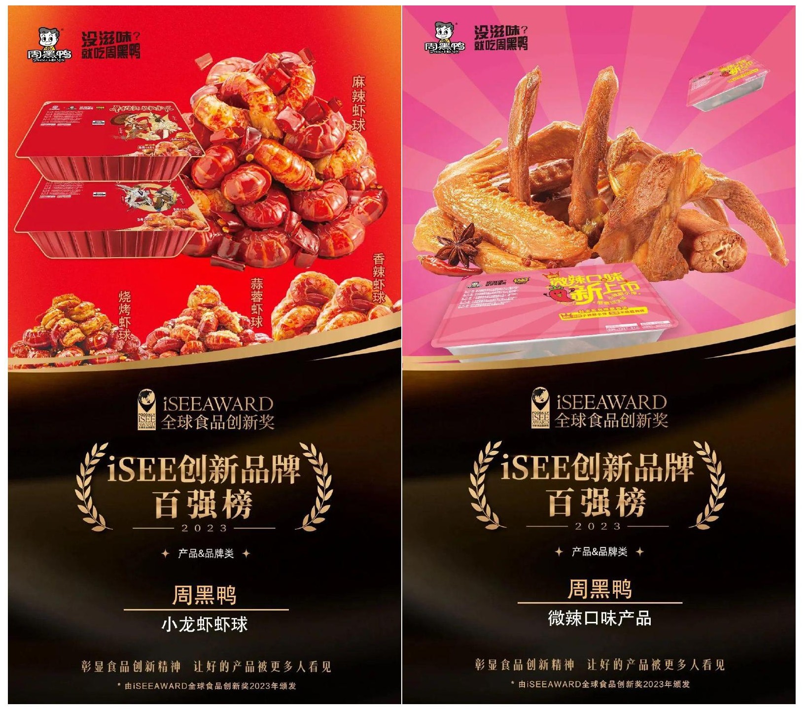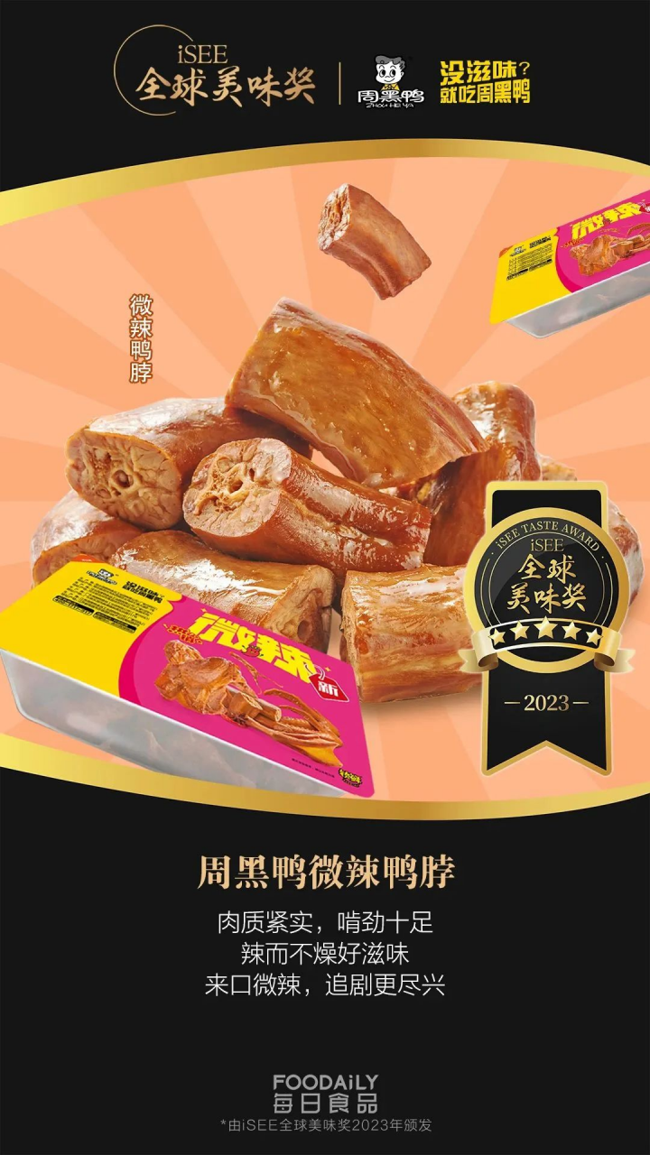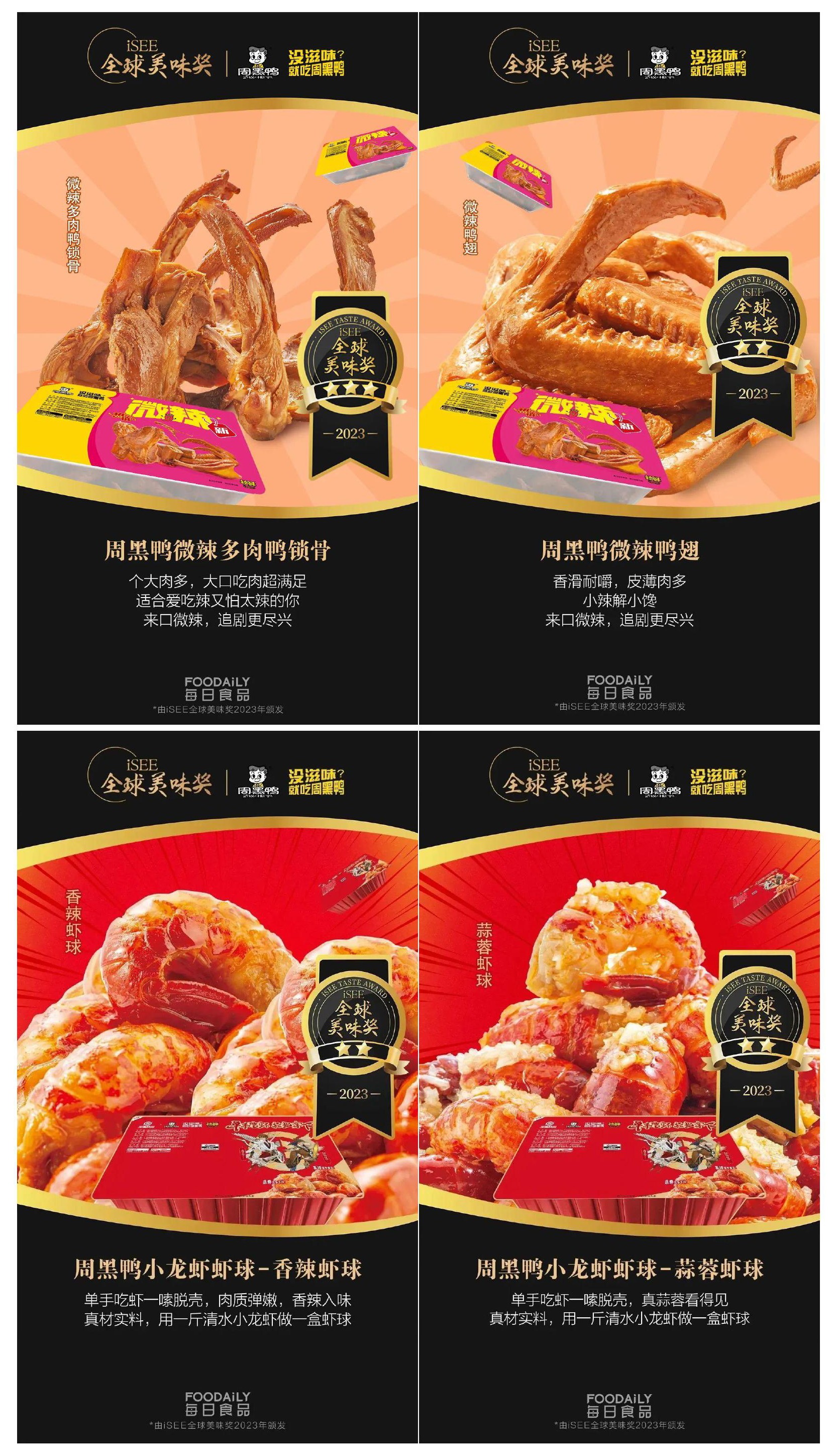 不僅如此,【微辣多肉鴨鎖骨】榮獲「iSEE☆☆☆全球美味獎」,【微辣鴨翅】【小龍蝦蝦球-香辣蝦球】【小龍蝦蝦球-蒜蓉蝦球】榮獲「iSEE☆☆全球美味獎」,【周黑鴨小龍蝦蝦球】【周黑鴨微辣口味產品】榮獲「iSEE全球食品創新百強榜」。共計7“iSEE”全球獎!